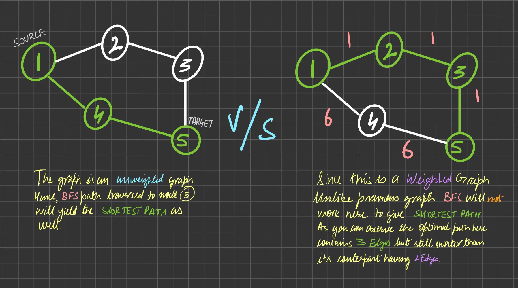 But this only works when all the edge weights are equal (the graph is unweighted). When we are given a weighted graph we can’t just sum up all the edge lengths to get the shortest path because unlike the previous case, we can in fact use more edges to reach the target node but still end up with a shorter distance. This idea is illustrated below.