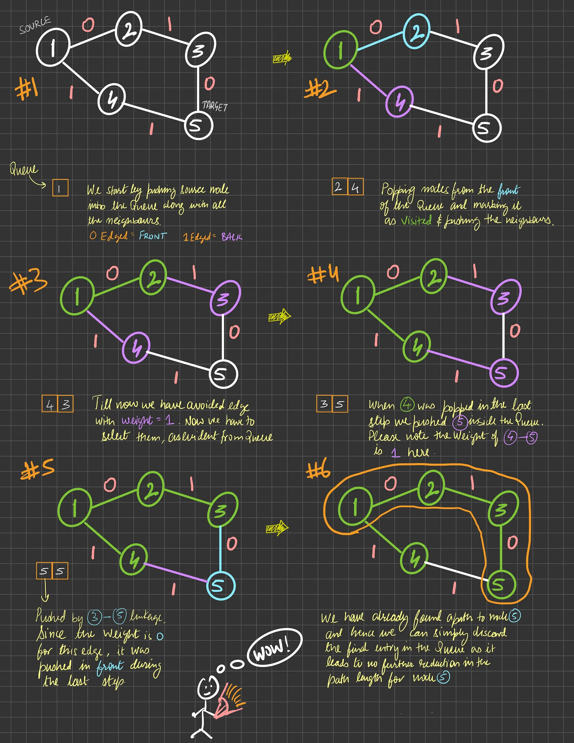 Hence, the nodes in the Deque are always sorted as per their distance from the source node. As long as we keep popping from the front while adding the edges with weight 0 to front & 1 to the back, our Deque Invariant will remain intact. This is the key idea behind 0–1 BFS as illustrated below.