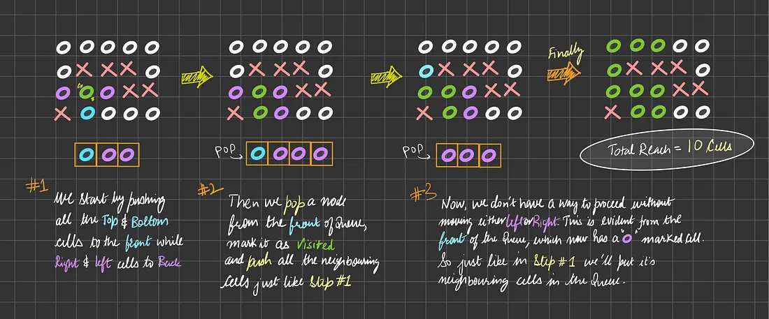 Another way to look at it, if we plan to travel to a cell C with a longer path than the shortest path, we might waste our precious Left-Right moves and reduce our reach further. Let’s see this idea in action below.